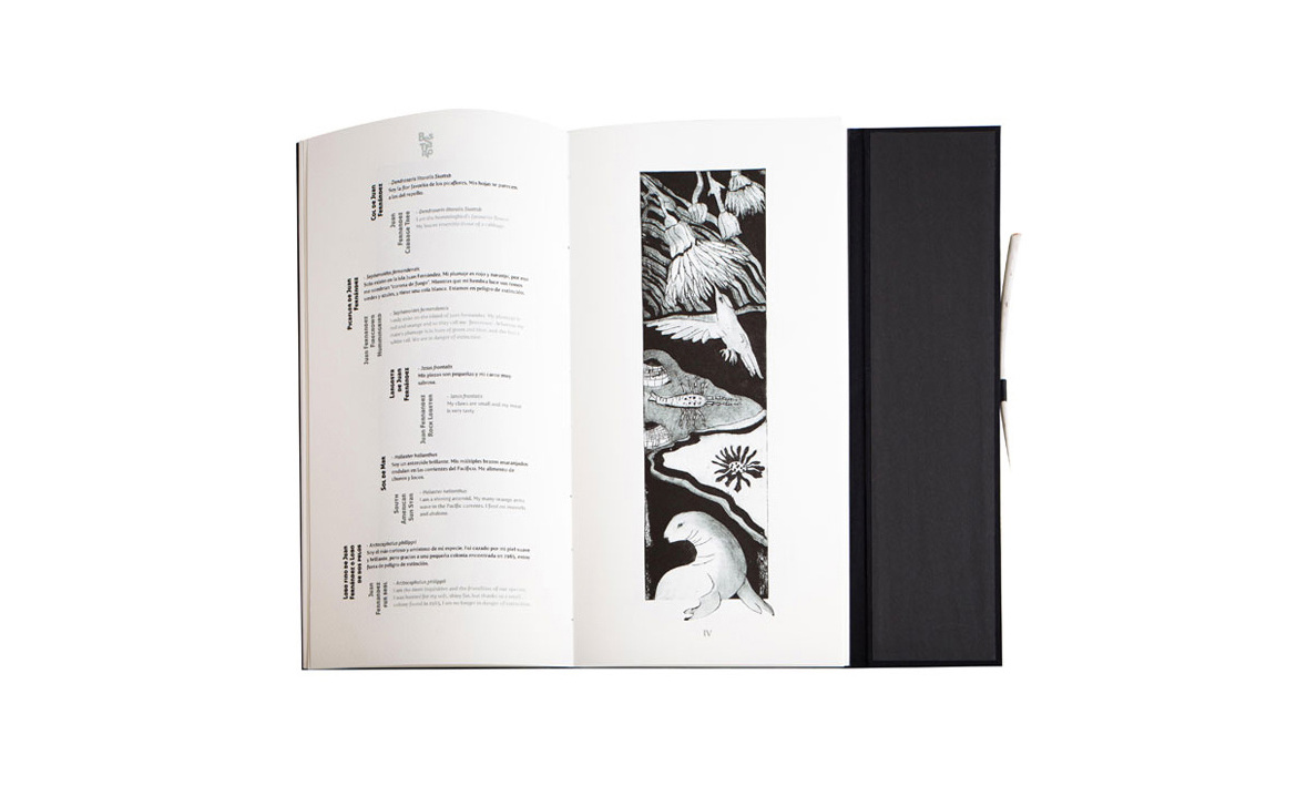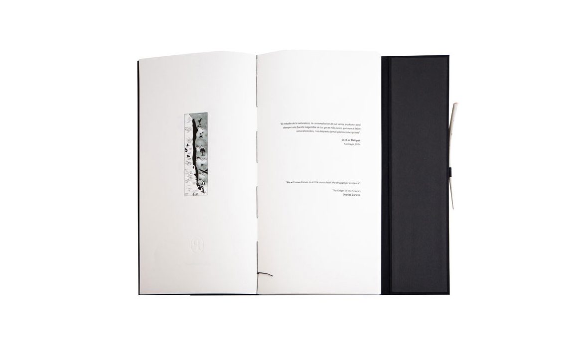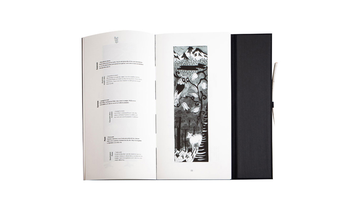 The magical quality of the wildlife can be safeguarded symbolically when closing the cotton and leather bound book with the sharp thorn from the Chilean acacia tree, while the vertical composition of the book echoes the geography of Chi